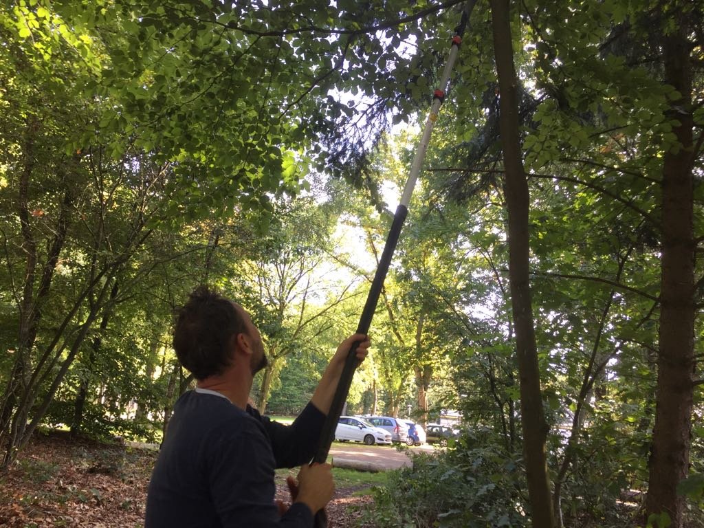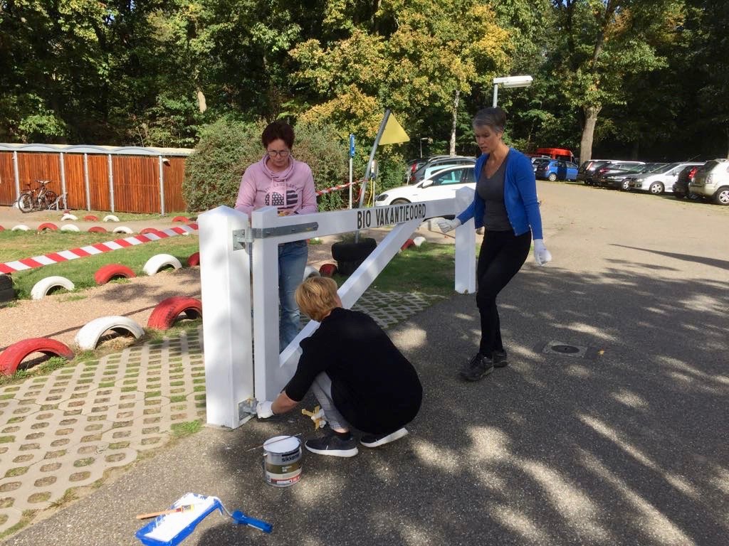 Het gebouw van de groenvoorziening op het Bio Vakantieoord was hoognodig aan een goede laag beits toe. Inmiddels staat het er strak bij, net als de weer fris witte slagboom bij de entree van het park. Daarnaast werd een heel bospad vrijgemaakt van weelderig groeiende takken en werd de materialenkast van het animatieteam in het MeetingPoint keurig geordend.