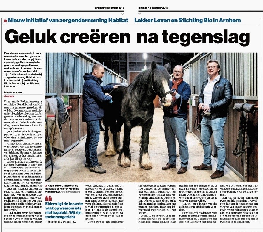 Stichting Bio en zorgonderneming Habitat Lekker Leven zijn onlangs onder de naam HLL Bio een samenwerking aangegaan. HLL Bio biedt jongeren en volwassenen in Gelderland en omstreken die willen re-integreren in de maatschappij, een persoonlijk begeleidingsprogramma, specifiek activerend werk en impulsopvang aan. Het park van Stichting Bio met de manege heeft hiervoor de ideale faciliteiten.